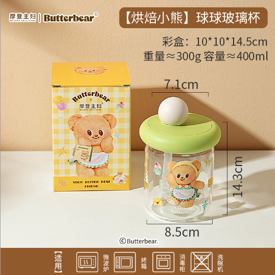 【新品上架】摩登主妇黄油小熊球球玻璃杯400ml 烘焙小熊 / Butter Bear Baking Bear Glass Cup By MODERN HOUSEWIFE
