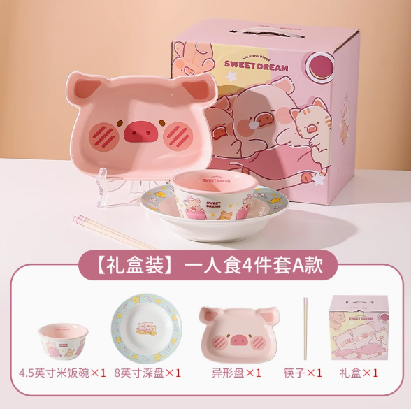 【新品上架】LuLu猪甜睡系列餐具套装一人食4件套A款 / Lulu The Pig Sweet Dream Series 4 Pieces Tableware Set A